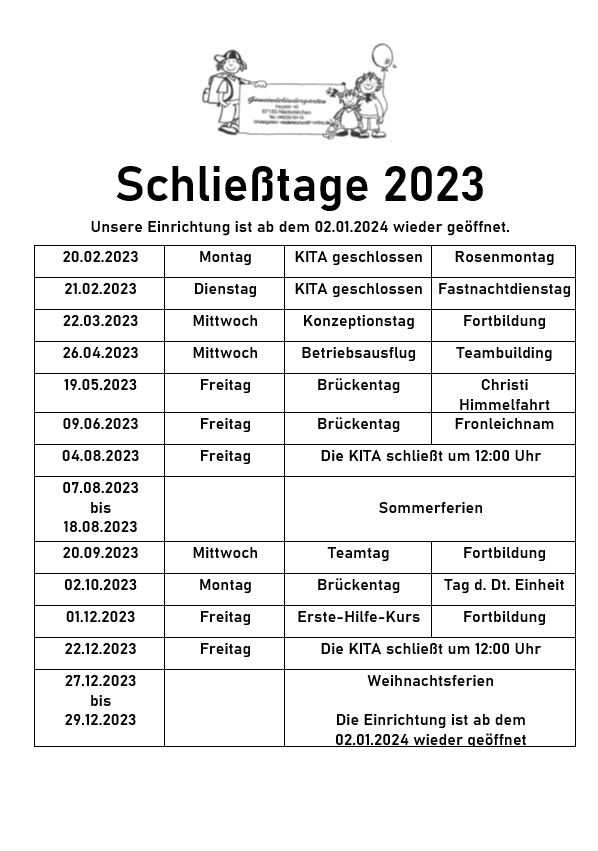 Aktualisierte Schließzeiten unserer KITA