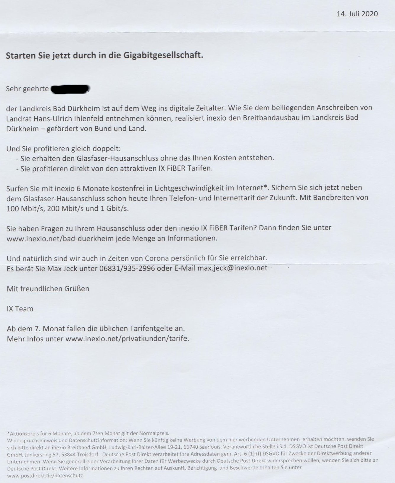Folgend können Sie das Anschreiben des Landkreises Bad Dürkheim und der Inexio Breitband GmbH sehen, welches per 07/2020 an die Haushalte verschickt wurde.