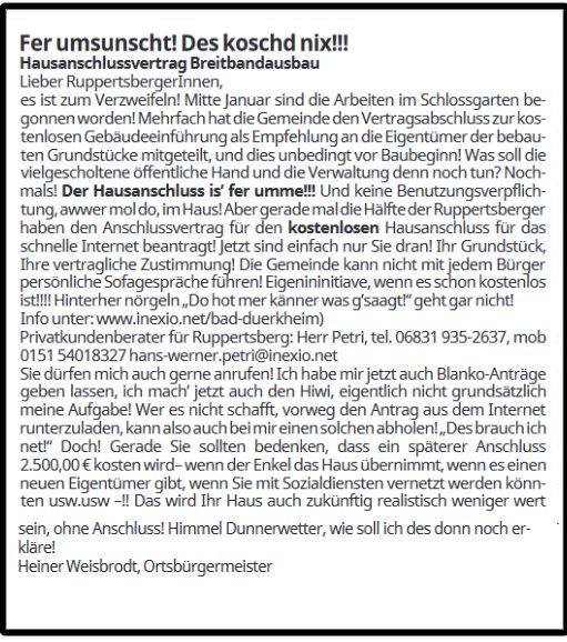 Mein Amtskollege hat es letzte Woche im Amtsblatt auf originelle Weise die Einwohner unseres Nachbarortes zum Abschluss der Hausanschlussverträge aufgerufen.