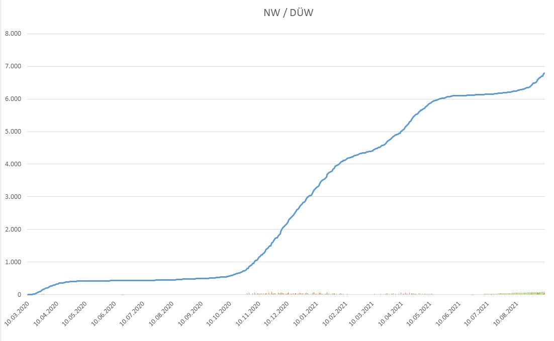 grüner Balken = Anzahl genesener Personen (erstmals vom und für LK- DÜW/NW veröffentlicht am 06.04.2020, ab 15.04.2020 auch für RLP und Pfalz)