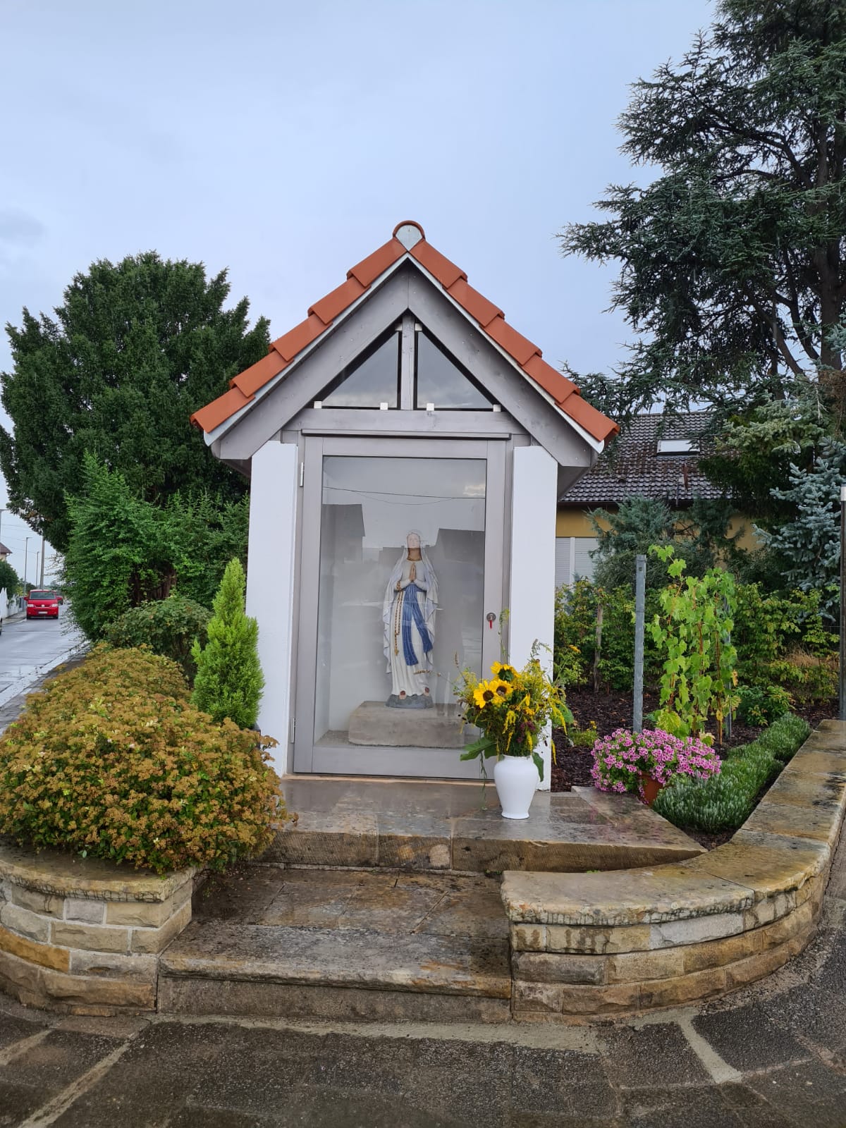 Ein Bildstock ist ein Ort der Erinnerung. Errichtet oft als Gedenkstätte, als Zeichen der Dankbarkeit, als Mahnmal. Der Feiertag Maria-Himmelfahrt ist ein passender Tag für die Einweihung. Ich freue mich, dass auch die Betriebe und Unterstützer an dieser Einweihung im Gottesdienst teilnehmen. Auch wenn Corona-bedingt leider kein Umtrunk, wie sonst stattfinden konnte. Danke möchte ich an dieser Stelle an alle beteiligten Betriebe sagen: Dem Bauhof für die Maurertätigkeiten, Holzbau Rüger, Maler Diaz, Gerhard Eckel und Klaus Wahl, die ehrenamtlich gestrichen haben, Bildhauerei Weisbrodt für die Gestaltung des Bodenbelags und Schreinerei Schnautz für Fenster/Verglasung. Euer Werk ist gut gelungen. Danke für euren Beitrag. Nun kann unser Bildstock als modernes Domizil für die Muttergottes dienen und Mahnmal, Erinnerungs- und Dank-Ort sein, für alle die daran vorbeifahren.