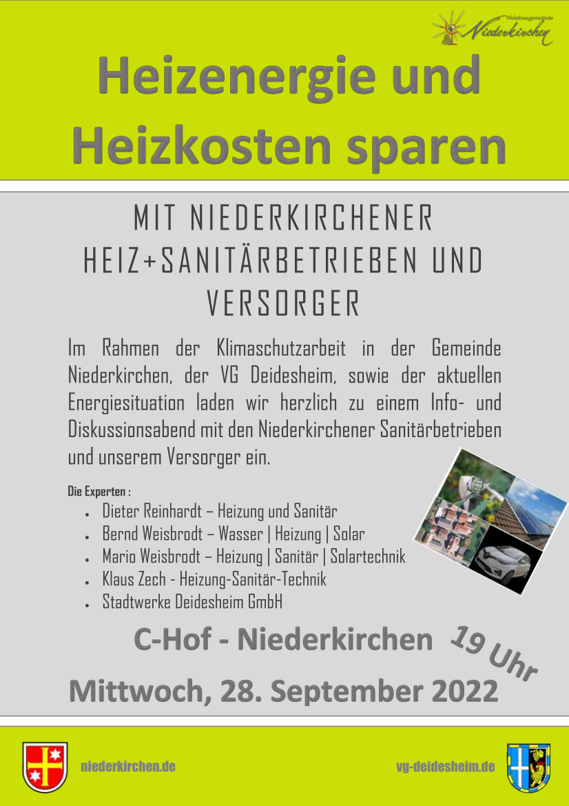 Im Rahmen der Klimaschutzarbeit in der Gemeinde Niederkirchen, der VG Deidesheim, sowie der aktuellen Energiesituation laden wir herzlich zu einem Info- und Diskussionsabend mit den Niederkirchener Sanitärbetrieben und unserem Versorger ein. Klima- und Umweltschutz, sowie die aktuelle Entwicklungen am Energiemarkt und in der Engergiepolitik machen Einsparungen beim Heizen erforderlich. Unsere Heizungs -und Sanitärbetriebe im Ort haben sich bereiterklärt in einem gemeinsamen Infoabend Möglichkeiten zur Einsparung von Heizenergie und somit auch Heizkosten aufzuzeigen.