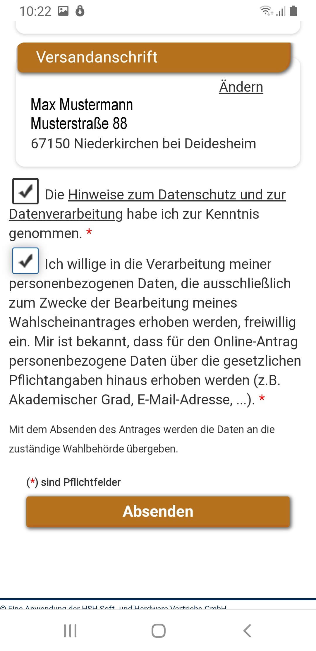 - Anschließend mit Absenden Briefwahlunterlagenanforderung abschließen und bestätigen