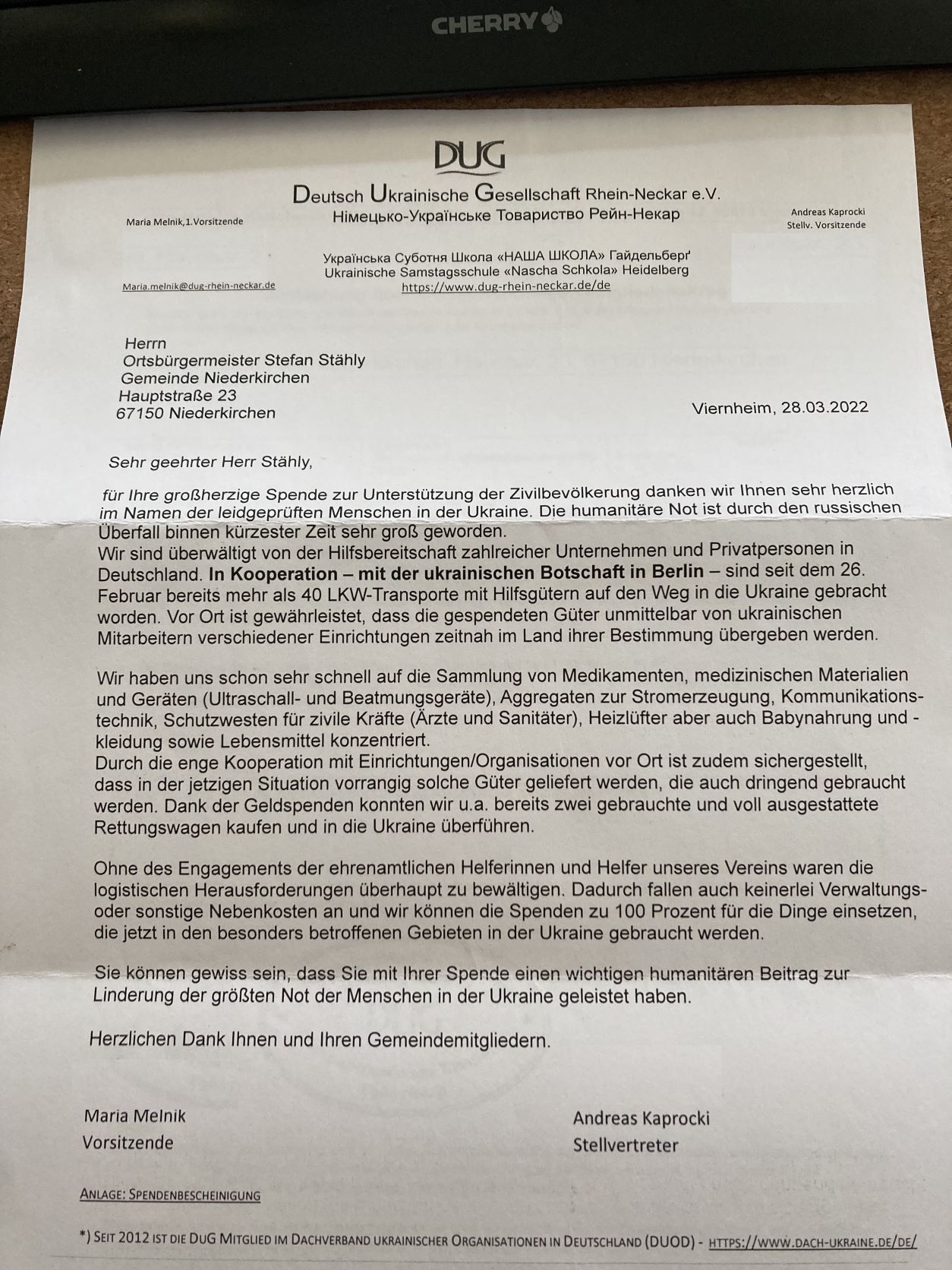 DUG bedankt sich für die Spende!