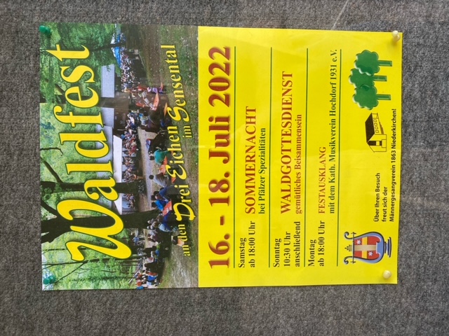 Der Männergesangsverein 1863 Niederkirchen e.V. lädt das darauf folgende Wochenende vom 16.-18. Juli 2022 zu seinem Waldfest an die Drei Eichen ins Sensental ein.